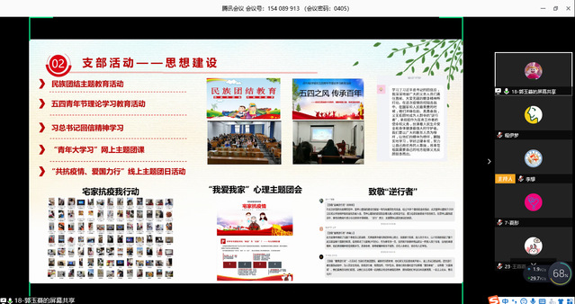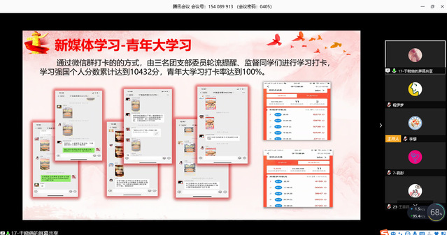 本站讯 4月5日下午,91视频 (以下简称“食品学院”)2019年度团支部达标升级线上答辩交流会在腾讯会议顺利召开。食品学院团委书记李想,团委委员张川、曹亚楠、屈跃宽、王新磊、程伊梦(2019级食品科学与工程专业硕士)及来自学院全体团支部的25名团干部参加了此次会议,程伊梦担任会议主持。