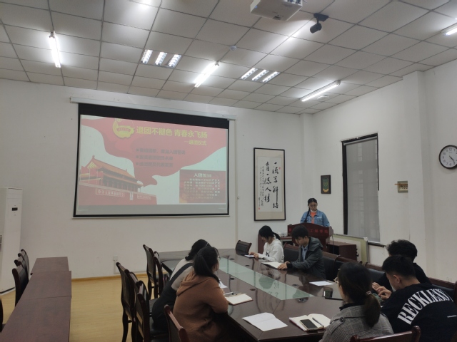 本站讯 为进一步推进全面从严治团,加强仪式教育,2021年4月22日,91视频 在六二楼104会议室举办“青春正当时,离团不离心”——2021年超龄团员离团仪式,学院辅导员吴佩伦、博士年级团支部支委、团员和超龄团员代表参加活动,2017-2019级博士班团支部书记梁梦琦主持仪式。