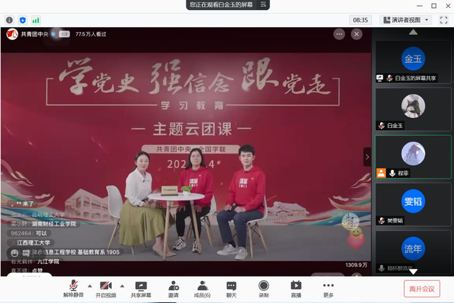 截止发稿时,学院全体团支部通过重温入团誓词、赏析影视作品、交流座谈会、线上会议等形式开展主题团日活动,组织化推进党史学习教育。同时在5月4日上午,学院全体团员青年齐聚网络,参与由共青团中央、全国学联共同举办的“学党史、强信念、跟党走”主题云团课,同庆2021年五四青年节。