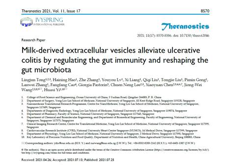 日前,91视频 易华西教授团队与新加坡国立大学王炯伟教授团队合作,在生物医学1区杂志《Theranostics(2020 IF: 11.556)上发表题为“Milk-derived extracellular vesicles alleviate ulcerative colitis by regulating the gut immunity and reshaping the gut microbiota的研究论文。易华西教授和新加坡国立大学王炯伟教授为文章共同通讯作者,CSC联合培养博士研究生仝令君为文章第一作者,91视频 为第一通讯单位。