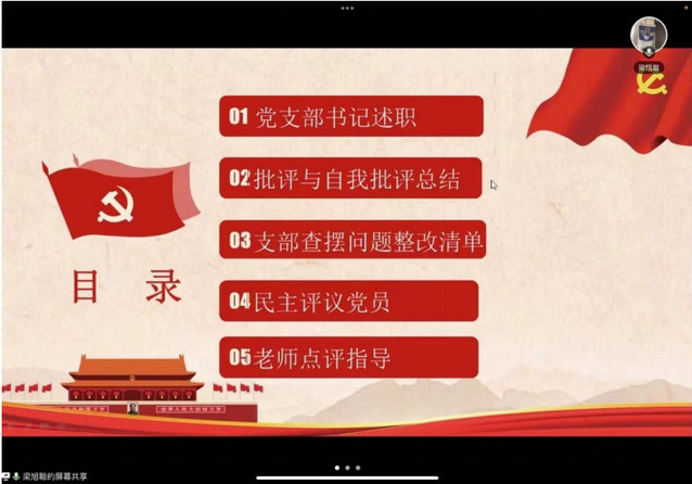此次会议由党支部副书记梁旭聪同志主持。会上,党支部书记张丹阳同志首先代表支部委员会进行了 2021 年度述职报告,分为履行工作职责情况、基本工作完成情况、重点工作落实情况、推进创新性工作情况、上年度查摆问题整改落实情况、存在问题及整改思路等六个部分来进行述职,并提出整改思路及措施。随后,由各个党小组组长针对前期党小组内部的批评与自我批评进行了检查总结,深刻剖析了问题产生的原因,之后又向全体同志公示了党支部查摆问题整改清单,分别围绕党支部党员教育机制不长效,党支部成员学习强国主动性不高,本学年支部品牌活动未确定等问题,提出了详细的整改措施,接着进行了民主评议党员的投票,投票选出张丹阳、梁旭聪、李潇、王文玲、乔玥、邓斯予 6 名优秀党员。 最后由孟老师对本次会议进行了点评与指导,他提出创新党支部品牌是一个党支部站稳脚跟必不可少的一项重要内容,此外我们青少年一代应该正确学习党员精神,把握党性知识学习的必要性,不要把党日活动等当作是义务来完成,而应该拥有自发性动力去积极参与活动,提升自我价值。