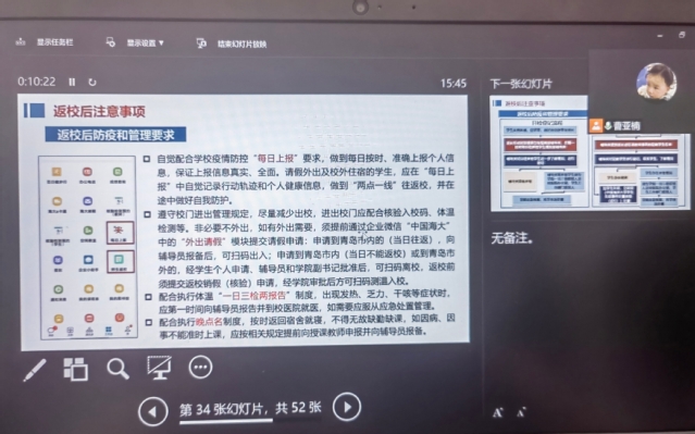 随后,曹亚楠强调新学期返校后的注意事项,详细介绍了必备的疫情防控知识以及返校后的防疫管理要求,希望同学们坚持做好每日上报、晚点名、一日三检,并严格遵守外出请假(报备)制度,加强自我防护,保证自身及他人的身心健康。同时,曹亚楠叮嘱同学们在新学期也要注意心理调适,呼吁大家收拾好心情,制定新学期计划,进行积极的心理暗示,学会科学管理时间,以饱满的精神状态投入到新学期的学习、工作和生活中。最后曹亚楠对西海岸校区启用情况进行简单介绍,希望大家提前做好准备,曹亚楠向即将搬迁至新校区的第一批“小主人”表示热烈的欢迎,同学们也对新校区生活充满期待。