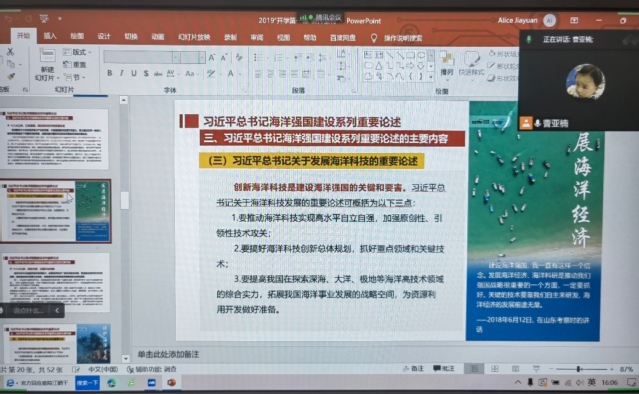 本站讯 为深入学习习近平总书记海洋强国系列重要论述,不断加强海大学子建设海洋强国的爱国教育,并向同学介绍返校注意事项以及新校区建设主要概况,使同学们能够尽快调整状态投入新学期的学习生活中。2022年8月18日,91视频 以线上“云会议”方式组织开展2019级本科生开学第一课,食品学院2019级全体本科生参加此次会议,会议由2019级本科生辅导员曹亚楠主持。