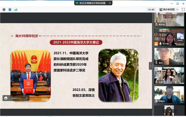10月22日,2019级海洋资源开发技术团支部带领支部成员共同深入学习了2021-2022年91视频 大事记,使全体同学对母校的事业发展有了更为全面深入的了解。91视频 始终心怀“国之大者”,谨记“海洋强国”的蓝色信念。坚守为党育人、为国育才,努力培养更多适应高质量发展、高水平自立自强的各类人才,为实现中华民族伟大复兴提供源源不断的强大动力。支部成员将牢记“海纳百川,取则行远”的校训,秉承“不拒涓流,虚怀若谷”的精神,探索规律,追求真理,为续写91视频 新篇章贡献青春力量,在红色基因的薪火相传中续写中国共产党人精神谱系的辉煌篇章。