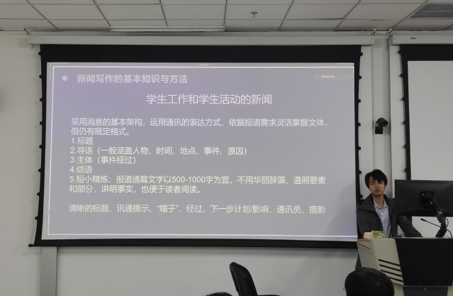 接下来,吴佩伦为同学们讲解了新闻写作的基本知识与方法,带领同学们学习了新闻的定义、基本要素、新闻体裁的具体特点,使同学们对新闻写作有了更深刻的认识。接下来,他向大家介绍了如何撰写材料,指出写材料都要经历“抄”,“改”,“写”三个阶段。此外,他还讲解了文章序号层级、数字规范用法等撰稿细节要求。