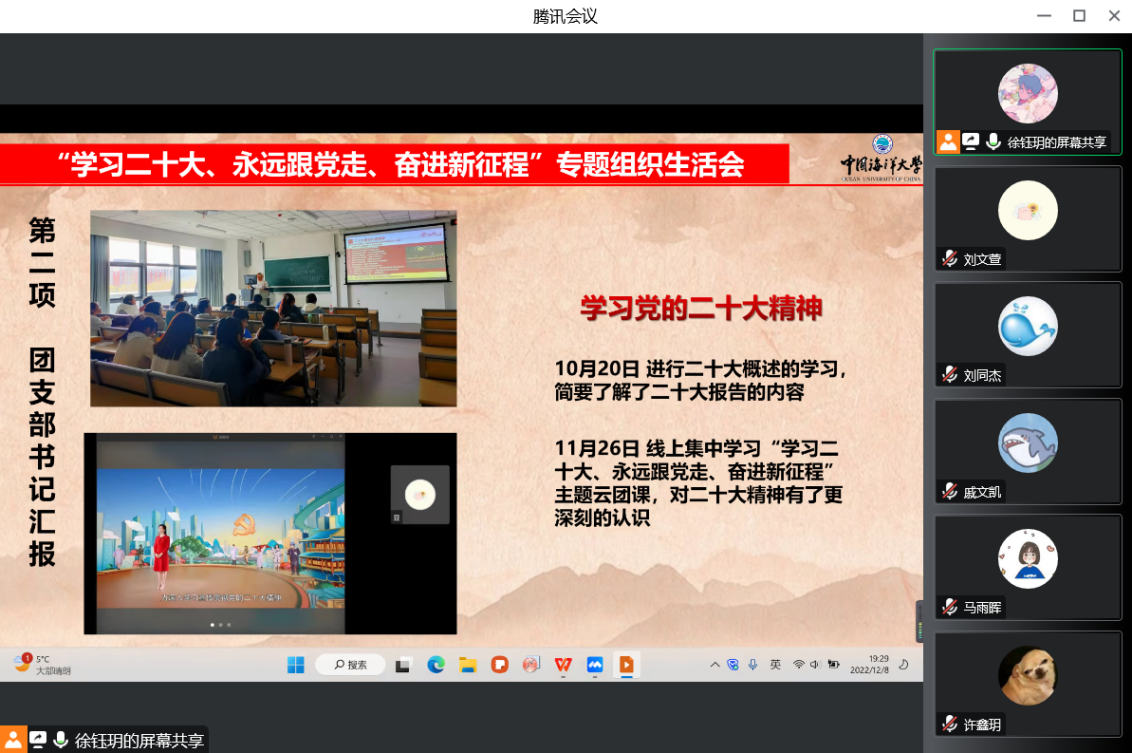 本站讯 为深入学习贯彻党的二十大精神,团结广大团员青年坚定不移听党话、跟党走,12月8日,2020级食品科学与工程1班团支部“学习二十大、永远跟党走、奋进新征程”专题组织生活会于线上腾讯会议召开,会议由团支部书记徐钰玥主持,班主任刘同杰、辅导员张川及班级全体同学参加会议。