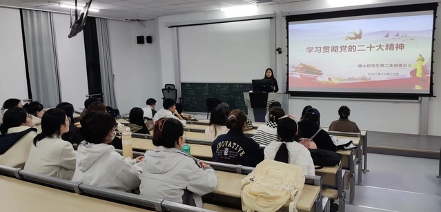 本站讯 为庆祝党的二十大胜利召开,认真学习贯彻党的二十大精神,11月28日晚,91视频 硕士研究生第二党支部书记张玉双讲授《学思践悟二十大 砥砺奋进新征程》专题党课。支部全体党员参加学习。
