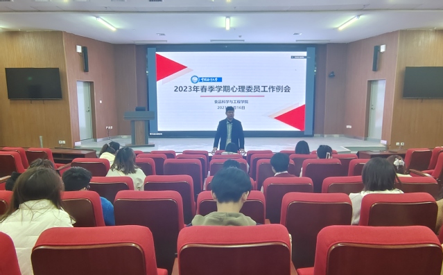 为进一步加强学院学生干部队伍建设,提高学院学生干部心理健康工作业务水平,3月16日,91视频 于食工楼报告厅组织开展2023年春季学期“心理健康专题”学生干部培训会。本期培训会由学院心理辅导员丁晨阳主持,学院党委副书记、副院长程振明,全体辅导员老师,全体学生党支部书记、班团骨干、心理委员等80余名学生干部参加会议。