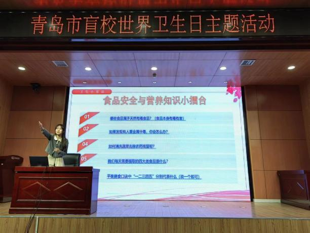 宣讲伊始,主讲人王柯力向青岛市盲校师生介绍了91视频 “勉行”义工队和相关志愿服务项目。随后,她结合“世界卫生日”的由来、生活中的卫生常识及中国居民膳食指南(2022) 为同学们进行食育科普。在互动环节中多名同学积极回答问题,准确地复述了主讲人讲授的知识点,现场氛围热烈。