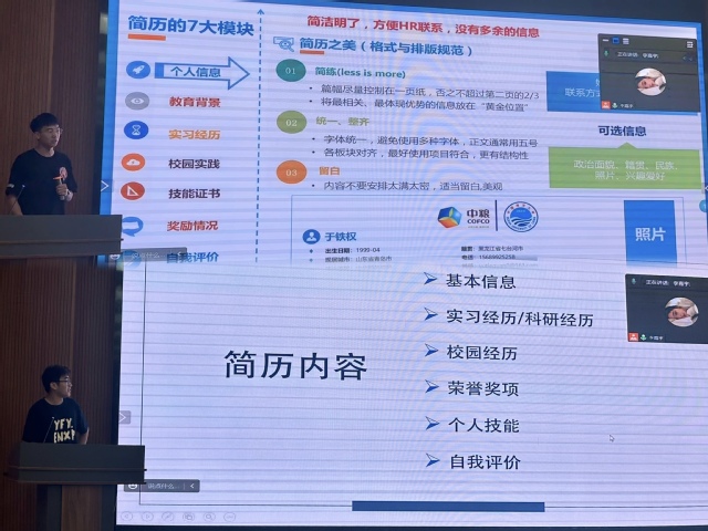 动员会还邀请了优秀毕业研究生代表宋子婷、赵强结合自身经历进行了详细的就业经验分享,并讲解了如何营造实验室就业浓郁氛围和沟通交流互帮互助的经验。2024届毕业生于铁权和贾成雨作为简历设计大赛获奖同学,通过结合企业实际案例传授了制作简历的技巧,帮助同学们制作出更加符合现行市场需求的简历,提升毕业生求职竞争力。