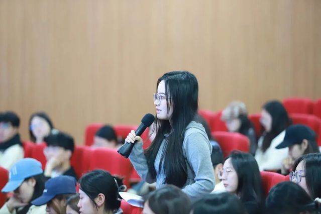 杨晓丽结合自身多年深耕茶饮研发的工作经历,深入浅出地为在场师生解码茶产业秘密。她重点分享了茶多酚、茶氨酸、咖啡碱、茶多糖等茶叶中的关键成分,介绍了康师傅如何通过技术创新和各种成分的比例组合调制出一瓶好茶饮的秘诀,从色、香、味、形等多维解析,让在场的师生对茶产业有了更全面、深入、立体的认识。精彩的分享也激发了同学们的好奇与热情,在交流环节同学们积极提问,杨晓丽耐心地回答了同学们的现场提问,对同学们提出的科研困惑、职业规划等问题进行了有针对性的答疑。