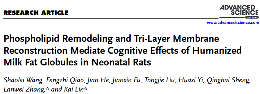 日前,91视频 功能性乳品与益生菌团队在乳脂肪球母乳化领域取得重要研究成果,该研究全文在线发表于国际知名综合学术期刊Advanced Science《先进科学》(Q1,中科院1区Top,IF2024=14.1),题为“Phospholipid Remodeling and Tri-layer Membrane Reconstruction Mediate Cognitive Effects of Humanized Milk Fat Globules in Neonatal Rats”。该论文通讯作者为张兰威教授和林凯副教授,第一作者为食品科学与工程学院2021级博士研究生王少雷,91视频 为唯一通讯单位。