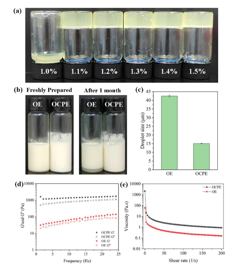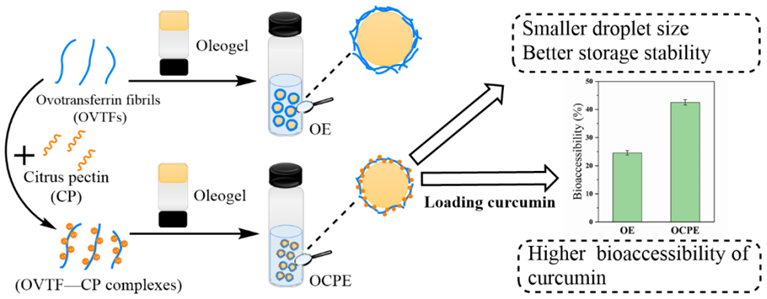 本研究首先通过构建OVTF-CP复合物来探索OVTFs与CP之间的相互作用。随后,讨论了上述相互作用对油凝胶基Pickering乳液性能的影响。以OVTF-CP复合物为稳定剂,油凝胶为油相,制备了油凝胶基OVTF-CP复合物稳定的Pickering乳液(OCPE)。采用基于油凝胶的OVTF稳定的Pickering乳液(OE)作为对照,以进一步了解OVTFs和OVTF-CP复合物稳定机制的差异。为了构建营养保健品的高效递送系统,使用OE和OCPE负载姜黄素,并评估它们作为姜黄素递送系统的潜力。